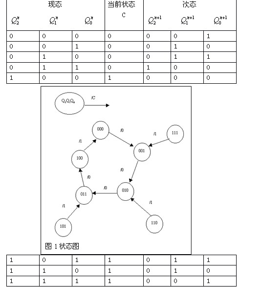 上述“000”,“001”,“010”,“011”、“100“这五个状态构成一个循环,称为“有效循环”或“主循环”。在主循环中的状态,都称为“有效状态”或“有用状态”。“101”,“110”,“111”这三个状态,位于主循环之外,称为“无效状态”或“无用状态”。对于具有若干个无效状态的时序逻辑电路,如果每个无效状态在若干个CP作用后都能转人有效状态,进入主循环,则称该电路具有自启动能力,否则称为没有自启动能力。图1状态图说明:图1且所示时序逻辑电路是具有自启动能力的。由上分析可知,此电路实际上是一个具有自启动能力的自然态序的五进制同步计数器,并以Q2的输出为进位输出。