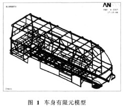 科技的进步推动着客车工业的发展,人们对客车的安全性、行驶平稳性、乘坐舒适性要求越来越高。客车的环保性和舒适性一般通过其静、动态性能来体现,所以对客车进行静、动态分析越来越必要。分析客车静、动态性能的方法中目前最为成功和应用最广的是有限元法[1]。有限元分析技术已经发展成为计算机辅助分析CAE的核心。用CAE方法设计阶段就能够对产品的各项性能进行评估,及早发现问题,从而大大缩短设计开发周期,降低开发成本。国外利用有限元法对车身的建模及静、动态性能的研究开始于20世纪60年代,现在已经具备了较全面的客车建模和动态性能分析技术和丰富的分析经验。国内20世纪70年代初期才开始有人用有限元法进行车身的静态分析。近些年来,众多科研人员都对基于有限元法的客车模型的建立及结构动态分析进行了探讨,但是由于客车本身是一个复杂的多体系统集合,外界载荷的作用多样,致使客车整车模型的建立、求解、分析始终是一个难题。模型建立的优劣直接影响后面分析结果的准确性和精确性,优良的有限元模型是确保分析成功的前提。