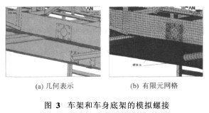 客车车身和车架的连接方式一般为螺接和焊接,车架和轮胎—悬架—车桥系统之间的连接主要是靠板簧的4个部件来连接。挡风玻璃采用粘贴,车内地板采用螺接。分析过程中,采用刚性连结和单元共节点来模拟这些连接方式。车架和车身骨架的连接通过刚性连接两个子模型上的节点来模拟;车架和悬架的连接,则是把车架模型上的节点与悬架模型中的相应节点刚性连接来模拟。图3为模拟螺接。