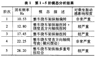 在建立了整车有限元模型后,采用BlockLanc-205法对模型进行模态分析求解。求解完毕得到1—50Hz范围内的模态,观察各阶振型彩斑图中车身地板骨架的位移大小。地板骨架位移大,变化剧烈说明该阶模态对乘坐振动感影响程度大,乘客能明显地感觉到整车共振,反之则无强烈振动感。部分分析结果如表1。
