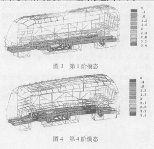 对比分析后发现固有频率为10.53Hz的第1阶模态和固有频率为22.25Hz的第4阶模态,对乘坐振动感影响程度是非常严重的,振型如图3、4。