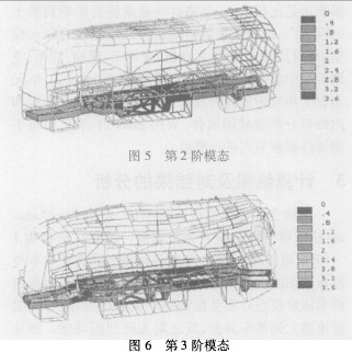 第2、3、5阶模态也是整车振动模态,但是这些模态被激发时产生的车身底板骨架振动相对第l、4阶来说要小,给乘员的振动感相对要小些,其中2、3阶振型如图5、6。