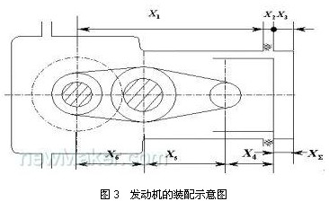 式中X1为汽缸体与曲轴主轴颈孔轴线的距离;X2为汽缸头垫片厚度;X3为汽缸头燃烧室深度;X4为活塞顶部至活塞销孔中心距;X5为连杆大小头孔中心距;X6为曲轴主轴颈至连杆轴颈的中心距。